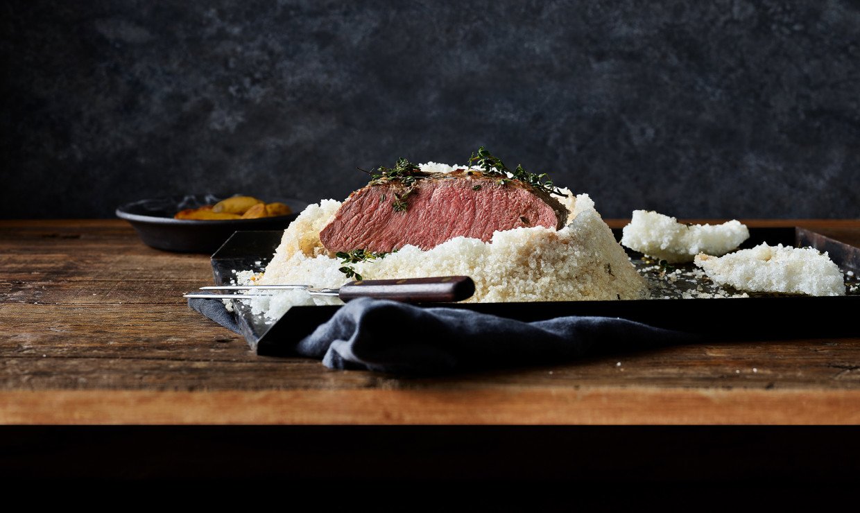 Mit einem langen kerntemperaturmesser durch die salzkruste bis in die mitte des roastbeefs stechen. Die salzkruste mit einem sgemesser aufschneiden. Gleichmig das fleisch mit der steifen masse umhllen.